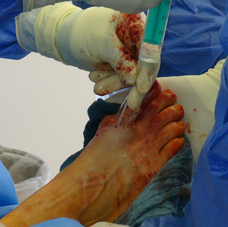 - Die Anlage einer Blutleere- oder Sperre ist optional. Wird eine Blutsperre angelegt ist es noch wichtiger, auf eine ausreichende Spülung zur Kühlung des Gewebes zu achten.
