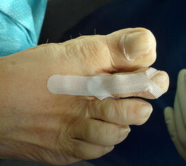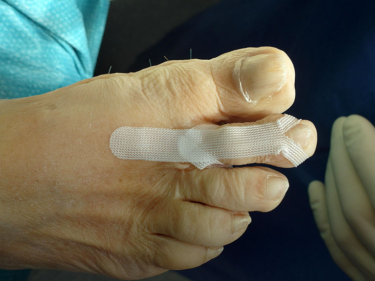 Lange und breite Steristrips (s.a. Abb. 1) werden längs auf ca. 4-5cm Länge eingeschnitten. Der erste der so entstehenden Zügel wird von plantar nach dorsal an der Zehenbasis um diese geschlungen, die Zügel sollten ähnlich der Tapeanlagegrundtechniken nach proximal auslaufen, um ein Abschnüren mit möglicher Abflußstauung zu verhindern.