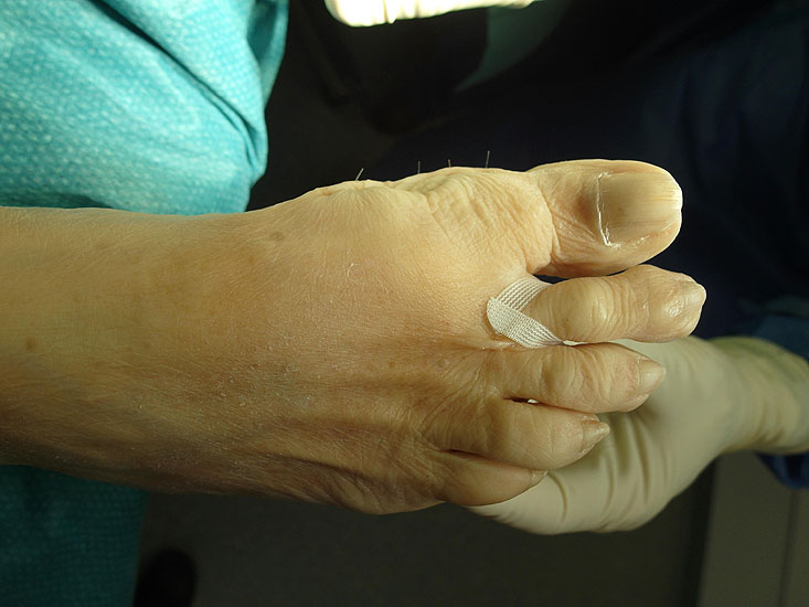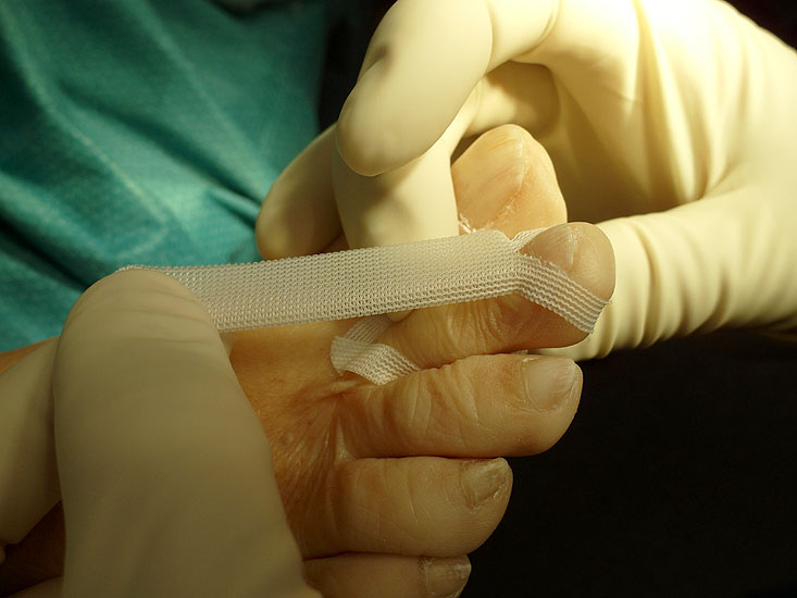 Wichtig: Nach minimalinvasiven Korrekturen der Kleinzehen kommt dem Tapeverband eine entscheidende Rolle zur Sicherung des Operationsergebnisses zu. Da keine zusätzlichen Drähte verwendet werden, führt ein vorzeitiges Entfernen möglicherweise zu einem schlechteren Behandlungsergebnis. Gleiches gilt, wenn die Zehe in einer Fehlstellung stabilisiert wird. Die Stellung der Zehe im Tapeverband sollte der Stellung entsprechen, die als finales Behandlungsergebnis gewünscht wird.