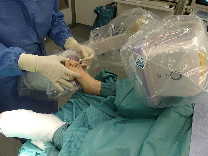 Abwaschen und steriles Abdecken des Fußes und Sprunggelenkes, die Operation erfolgt in der Regel ohne Blutleere. Der Bildwandler steht am Fußende, in Längsrichtung zum Patienten geneigt, der Patientenfuß kann leicht auf dem Röntgendetektor aufliegen. Die orthograde Ausrichtung des Fusses, erreicht durch eine Unterpolsterung der gleichseitigen Glutealregion ist zu empfehlen. Der Operateur steht oder sitzt in Längsrichtung des Patienten hinter dem Röntgendetektor. So können die mehrfach nötigen Bildwandlerkontrollen unkompliziert und zeitsparend durchgeführt werden (Abb 3).