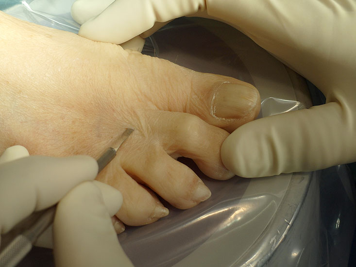 Bei der klinischen Untersuchung finden sich schmerzhafte Hyperkeratosen oder Ulzerationen. Derartige Veränderungen finden sich auch über knöchernen Vorsprüngen im Zehenbereich und können ebenso wie einige zu einer Zehenfehlstellung führende Knochendysplasien minimalinvasiv mit den nachfolgend aufgeführten Vorgehensweisen therapiert werden.