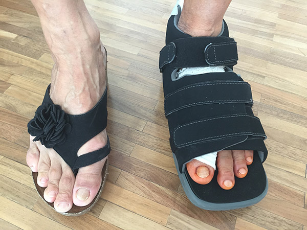 - Bei Vorfußkorrekturen kommt ein flacher Verbandsschuh zur Anwendung. Im flachen Verbandschuh erfolgt die Mobilisation unter Vollbelastung ab dem ersten postoperativen Tag. Unterarmgehstützen werden normalerweise nicht benötigt. Tragen des flachen Verbandsschuhes außer Haus für insgesamt 6 Wochen postoperativ. Zu Hause ab dem 8. Tag postoperativ Vollbelastung ohne Schuh schmerz- und schwellungsadaptiert erlaubt. Dies wird von den meisten Patienten sehr gut toleriert und als wesentlich angenehmer empfunden als die Mobilisation im Verbandschuh. Nach komplexeren Eingriffen kommen restriktivere Behandlungskonzepte zur Anwendung.