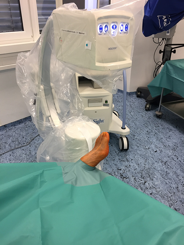 - Lagerung bei Vorfußoperationen: zu operierendes Bein frei beweglich gelagert, Rückenlage, Fuß entweder aufgestellt auf OP-Tisch mit Seitenstütze am Oberschenkel und eingefahrenem C-Bogen oder Fuß über distales Tischende hinausragend mit direkter Lagerung des Fußes auf Mini-C-Bogen.
