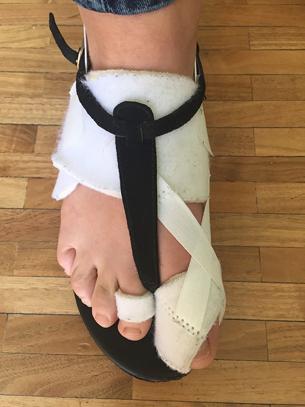 - Eine weitere Woche später erneut klinische Kontrolle und Übergang auf einen konfektionierten Schlaufenverband. Zu dessen korrekter Anlage wird der Patient an diesem Tag ausführlich angeleitet, ebenso zur selbständigen Beübung des Großzehen-Grundgelenkes.