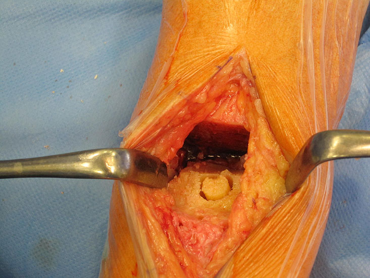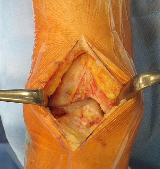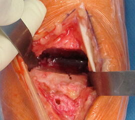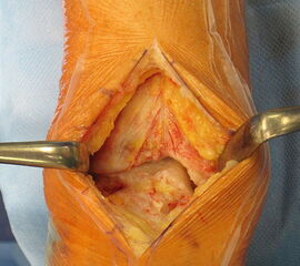 - Wundheilungsstörung infolge einer hohen intraoperativen Druck- und Zugbelastung auf den periartikulären Weichteile; Lösung: dosierte Weichteilbehandlung durch die Hacken durch den Assistenten; aktive Erinnerungen während der Operation (Abb. 20 und 21)