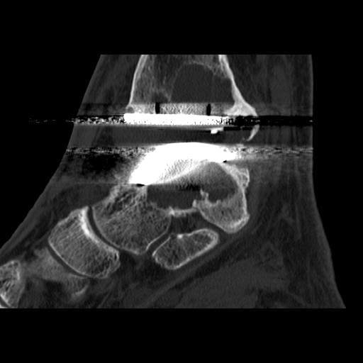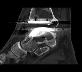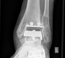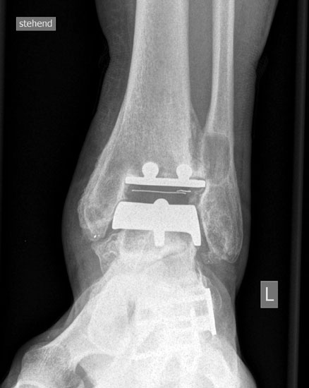 - Prothesenlockerung: Komponentenwechsel möglich, wenn eine ausreichende Knochensubstanz zur Wiederverankerung einer zementfreien Revisionskomponente vorhanden ist. Alternative: Prothesenausbau und nachfolgende OSG Arthrodese, ggf. Erweiterung auf eine pantalare Arthrodese bei großen knöchernen Defekt am Talus mit Destruktion des Subtalargelenkes erforderlich