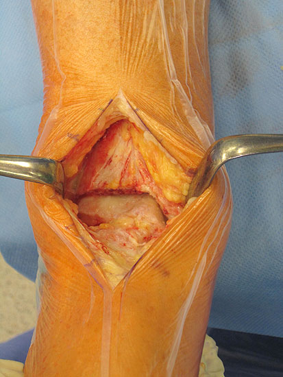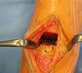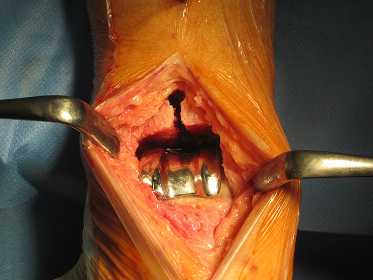 - Dorsales Auslaufen der Tibiakomponente, wenn beim Bohren der Tibiaverankerung oder beim Einschlagen der Tibiakomponente ventral zu großer Druck ausgeübt wird.