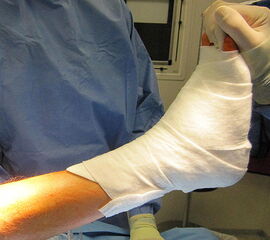 - 1.-6. Woche Ruhigstellung in einer dorsalen Unterschenkel-Kunststoffschiene, nach Abschwellung am Tag Ruhigstellung in einem Unterschenkelwalker, zur Nacht in der Schiene; bei knöchernen Zusatzeingriffen bzw. Sehnentransfers weitere Ruhigstellung im Unterschenkelwalker am Tag bis Ende der 12. Woche; aktiver Hinweis auf einen vollständigen Fersenkontakt im Walker zur Vermeidung einer Spitzfußkontraktur.