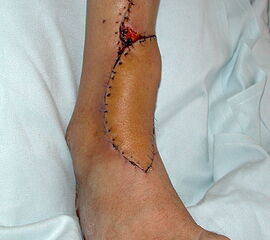- Unterschenkelamputation bei nicht beherrschbarem Infekt, Fehlschlag einer sekundären Weichteildeckung bzw. bei postoperativen Durchblutungsstörungen.