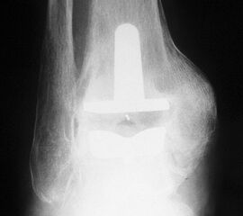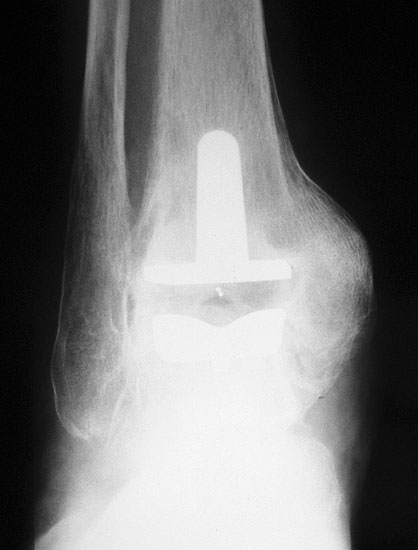 - Bei Überdimensionierung der Prothesenkomponenten: Impingementsymptome, knöcherne Destruktion distale Fibula/Innenknöchel.
