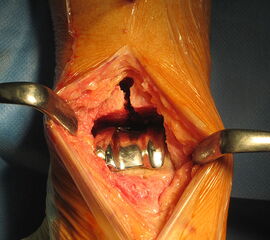 - Polyethylenabrieb, insbesondere bei verbliebener Rückfußdeformität oder persistierender Instabilität nach Prothesenimplantation. Als prognostisch ungünstig gilt, wenn der Gleitkern über die metallischen Komponenten der Prothese hinausragt.