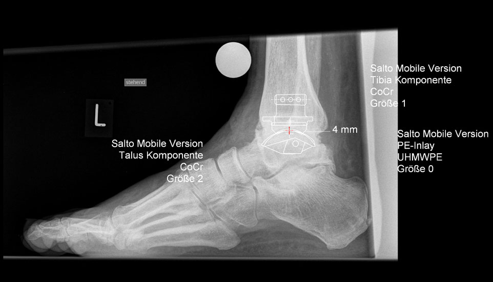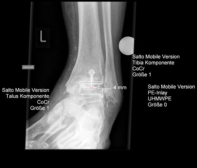 In der operativen Therapie der fortgeschrittenen und schmerzhaften Arthrose des oberen Sprunggelenkes (OSG) haben sich die Implantation einer OSG-Totalendoprothese und die OSG-Arthrodese etabliert. Langzeitprobleme nach einer OSG-Arthrodese in Form von symptomatischen Anschlußarthrosen (bis 80%ige Fusionsrate einzelner oder mehrerer peritalarer Gelenke 10 Jahre nach Arthrodese 12345) forcierten die Weiterentwicklung der OSG-Endoprothetik, trotz der Fehlschläge nach Implantation der einachsigen Zweikomponentenmodelle in den 70er Jahren. Mit der Entwicklung der modernen 3-Komponenten-OSG-Prothesen, welche Seit- und Rotationenbewegungen zulassen und eine zementfreie Implantation mit geringer knöcherner Resektion ermöglichen, konnten gute mittlere Standzeiten erreicht werden, so dass die Implantation einer OSG-Prothese inzwischen eine gleichwertige Alternative zur OSG-Arthrodese darstellt 6789 (Hintermann 2005).