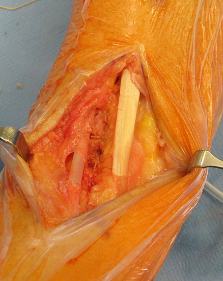 Mögliche Ursachen können eine zu weit medial plazierte Tibiakomponente oder eine zu weit mediale, nicht nach lateral konvergierende Sägerichtung im Rahmen der ventrodorsalen distalen Tibiaresektion sein (Abb. 19). - intraoperative Außenknöchelfraktur: