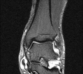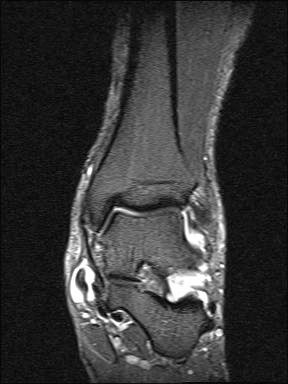 Aufgrund der geringen Zuverlässigkeit der klinischen Untersuchung und der konventionell radiologischen Bildgebung ist die Bildgebung der Wahl die Kernspintomographie (Szeimies 2014). Allerdings bestehen auch bei der Kernspintomographie klare Grenzen, vor allem hinsichtlich der Beurteilung der mechanischen Stabilität. Zuverlässige Aussagen sind möglich zum Ausmaß der Verletzung, insbesondere welche Bandanteile betroffen sind, sowie zu Begleitverletzungen. Chun et al. 11 berichteten über eine Sensitivität von 84% und eine Spezifität von 93,5% für Läsionen des Deltabandes im MRT. Befunde im MRT umfassen eine flächige Ödematisierung und Einblutung entlang des Deltabandes, meist unter Aussparung der kräftigen Pars tibiotalare posterior. Ein gewellter Verlauf, sowie eine Unterbrechung der Kontinuität der Faszikel sind Zeichen eines strukturellen Schadens. Teilweise finden sich Knochenkontussionsödeme, aber auch kortikale Absprengungen am lateralen Talusrand, der Talusschulter und am Außenknöchel. Fast immer findet sich ein Gelenkerguss (Abbildung 4).