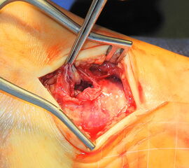 Der Zugang zum Deltaband erfolgt entsprechend der Zielstruktur über einen ca. 5-8 cm langen, nach ventral gebogenen Zugang (Abbildung 8).