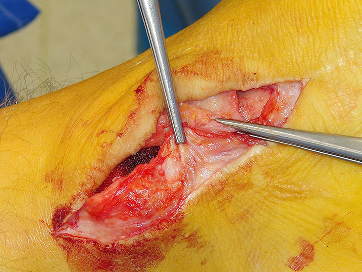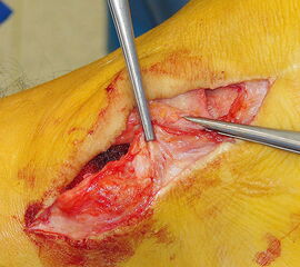| Typ II | Elongiertes, insuffizientes Band | Schmerzen im Bandverlauf. Keine straffe Bandstruktur tastbar, aber auch keine Defektzone. | Inzision und Doppelung der elongierten Bandstrukturen. Bei insuffizientem Gewebe Augmentation (Tib. posterior Sehne, Periostlappen). |