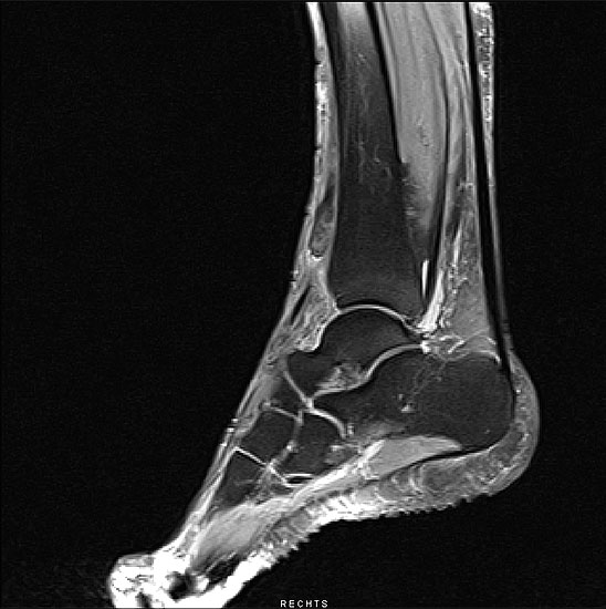 Der Gold-Standard zur Diagnostik einer ansatznahen Tendopathie des M. tibialis anterior ist die Magnetresonanz-Tomographie (Abbildung 2).