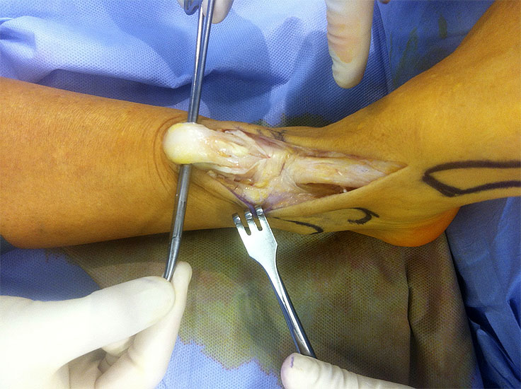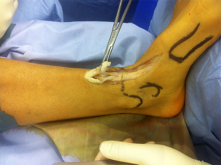 Eine dieser Therapiemöglichkeiten besteht in der Rekonstruktion durch einen freien Sehnentransfer im Sinne einer Interpositionsplastik . Als freies Sehnentransplantat bietet sich die Sehne des M. peroneus brevis an. Diese Methode wird von Forst et al. 26 in ihrer Veröffentlichung dargestellt. Die Entnahmestelle des M. peroneus brevis wird durch Tenodese mit der Sehne des M. peroneus longus versorgt. Weitergehende Ergebnisse sind hierzu aber nicht bekannt.
