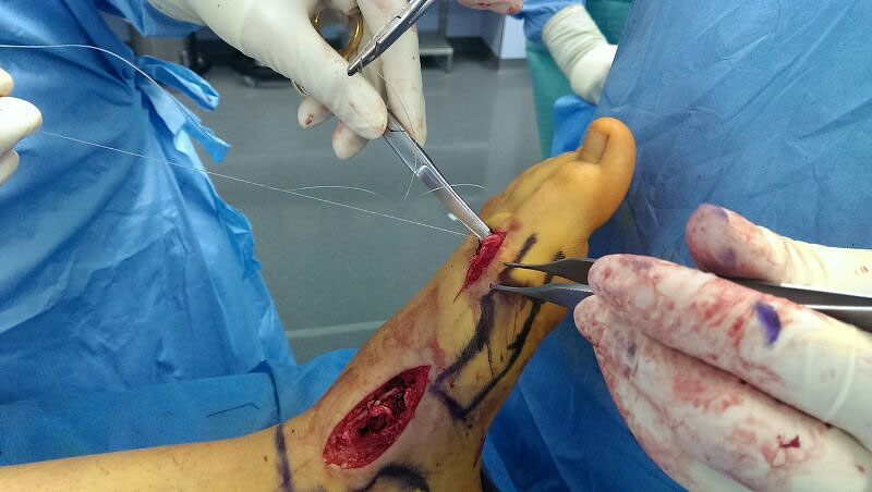 - Es besteht die Möglichkeit eines freien Sehnentransplantates zur Rekonstruktion der Tibialis anterior-Sehne. Als Transplantat bietet sich die M. semitendinosis- oder M. gracilis-Sehne an.
