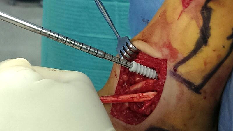- Ein entsprechender Längengewinn ist jedoch mit einer Umkehrplastik zu erreichen (Abbildungen 3a-c). Die Verankerung am os cuneiforme mediale kann hierbei mittels transossärer Sehnenfixation oder Ankerfixation stattfinden. Mit Hilfe des distalen Stumpfes sollte eine zusätzliche Augmentation der Fixierung stattfinden.