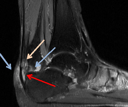 Das MRT stellt den Goldstandard bei der Beurteilung von Sehnen und Weichteilgeweben dar. Die optimalen Sequenzen hängen häufig von dem verwendeten Gerät ab, zumeist werden jedoch T1-gewichtete und flüssigkeitssensitive STIR sowie Fett supprimierte intermediär gewichtete Sequenzen in axialer und sagittaler Schnittführung durchgeführt 12. Das MRT ermöglicht insbesondere den Nachweis von intratendinösen Veränderungen und ansatznahen Partialrupturen. Daneben können im MRT das Paratenon, die ansatznahen Bursen und auch die differerentialdiagnostisch in Frage kommenden Strukturen wie die FHL-Sehne und das Os trigonum mitbeurteilt werden. Ein Ödem in der Tuberositas des Calcaneus kann degenerative Veränderungen der Gleitfläche zur Achillessehne hin anzeigen. Aufgrund der Schnittführung und des zum Teil geringen Kontrastes ist die Identifikation und Lokalisation von Ossifikationen jedoch gelegentlich zur operativen Planung nicht ausreichend (Abb 4).