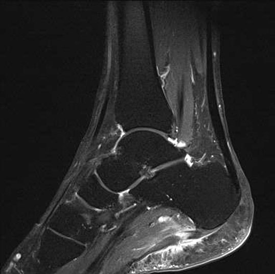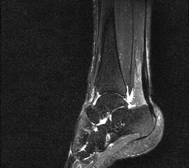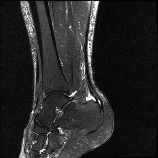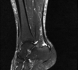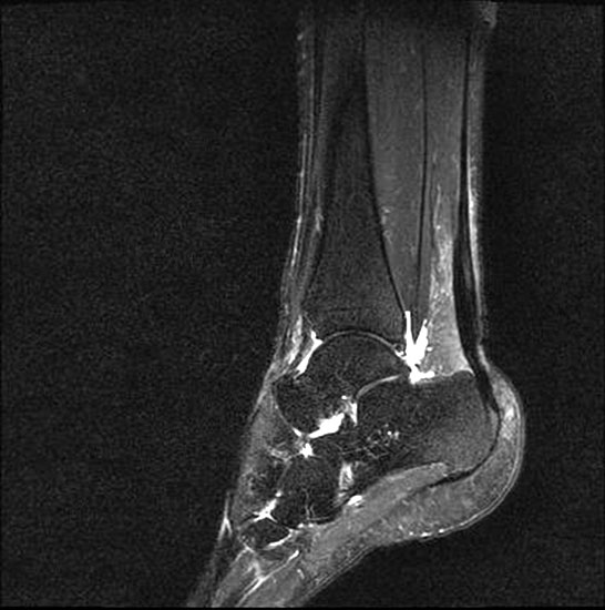 Hier befindet sich ca. 3-5 cm proximal des Tuber calcanei ein als „kritische Zone“ benannter Bezirk, der durch eine ungünstige arterielle Blutzufuhr gekennzeichnet ist (letzte Wiese). Hier finden sich häufig spindelförmige Schwellungen, die bei MRT-Diagnostik nicht selten partielle Nekrosen und Partialrupturen der Achillessehne aufweisen (Abb. 14).