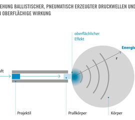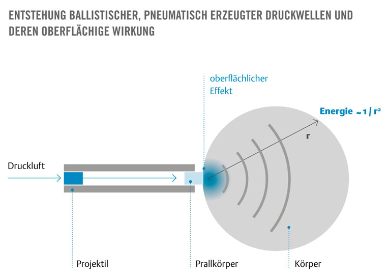 Radiale Druckwellen werden durch Kollision fester Körper erzeugt. Ein durch Druckluft beschleunigtes Projektil wird auf einem Prallkörper abrupt abgebremst. Beim Zusammenprall des Projektils mit dem Prallkörper überträgt dieser durch seine Auslenkung eine Druckerhöhung auf das angekoppelte Gewebe.
