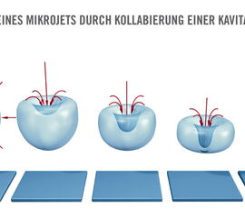 Der physikalische Effekt von fokussierten Stoßwellen beruht zum einen auf einer direkten Krafteinwirkung an Grenzflächen mit unterschiedlichem akustischem Widerstand (Luft, Weichteile, Knochen). Zum anderen besteht ein indirekter Effekt durch sogenannte Kavitation: Nachdem die Stoßwelle das Gewebe passiert hat, entstehen unmittelbar Kavitationsblasen, durch deren Kollaps sogenannte Microjets mit großer Energie und Durchschlagskraft entstehen. In beiden Fällen wird eine mechanische Energie im Gewebe freigesetzt, die zu entsprechenden Reaktionen führt.