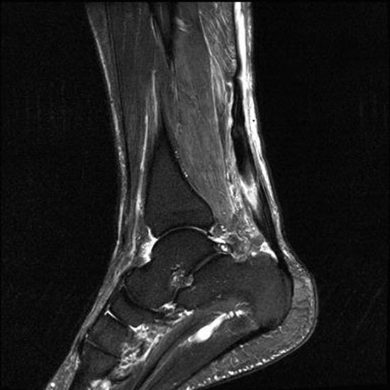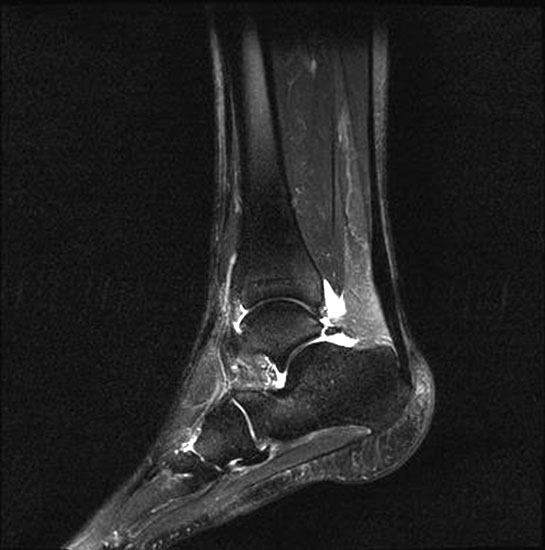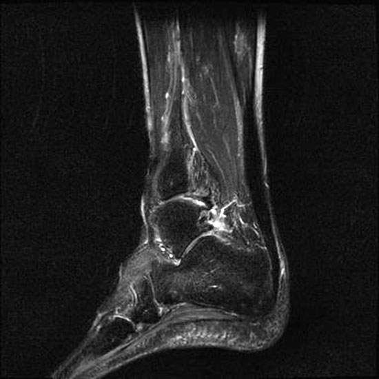 Unabhängig davon können insbesondere chronische Insertionstendinosen der Achillessehne von Partialrupturen (Abb. 15) und erosiven Läsionen des dorsalen Fersenbeines begleitet sein.