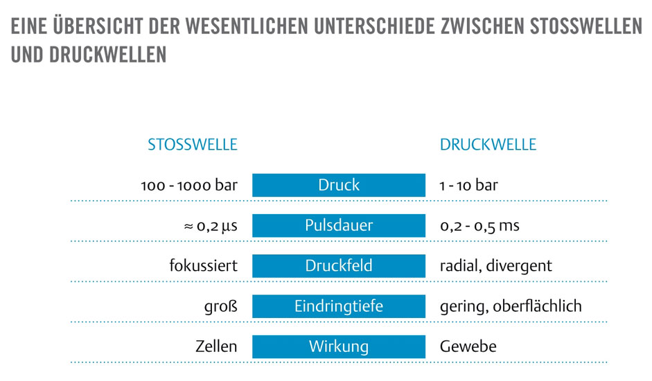 Bei dieser Form der Druckwelle ist die Pulsdauer um den Faktor 1000 länger und die Spitzendrücke um den Faktor 10-100 geringer als bei der fokussierten Stoßwelle (Wess 2006).