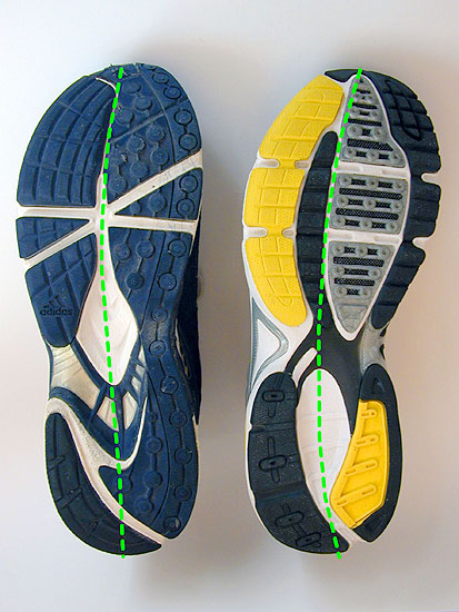 Die Reduktion von Hebelarmen im Rückfußbereich wird durch speziell abgesetzte Zonen erreicht, die sich leichter deformieren und so den Fuß beim Fersenaufsatz nicht in die Pronation drücken. Das „Crash-Pad™“ von Nike ist ein Beispiel für diese Technologie Reebok™ entkoppelt die Sohle im Fersenbereich durch multiple Materialaussparungen im Sohlenmaterial, so dass eine Bewegung von wenigen Millimetern zwischen Außensohle und dem Schuh möglich wird (Abbildung 9). Dies führt zu einer Reduktion der in Richtung Pronation wirkenden Kräfte während der ersten Millisekunden nach Bodenkontakt.
