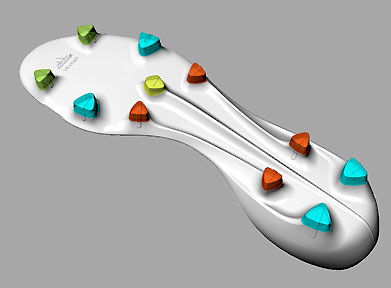 Basierend auf Vorteilen der runden Stollen, die bei den Spielern eine hohe Akzeptanz besitzen und eine gleichmäßige Stollendruckverteilung ermöglichen und den Vorteilen der länglichen Stollen, wurde eine neue Generation von Stollen entwickelt, die die jeweiligen Vorteile vereinen sowie zusätzlich noch bessere Beschleunigungseigenschaften bieten. Die seitlichen flachen Stollenwände wurden beibehalten, in Richtung der Sohle wurden große Radien eingezogen, um ähnlich der runden Stollen eine gleichmäßigere Druckverteilung zu bieten. Zudem wurde die Größe und Ausrichtung entsprechend der positionsbezogenen Funktion angepasst (Abb. 3).