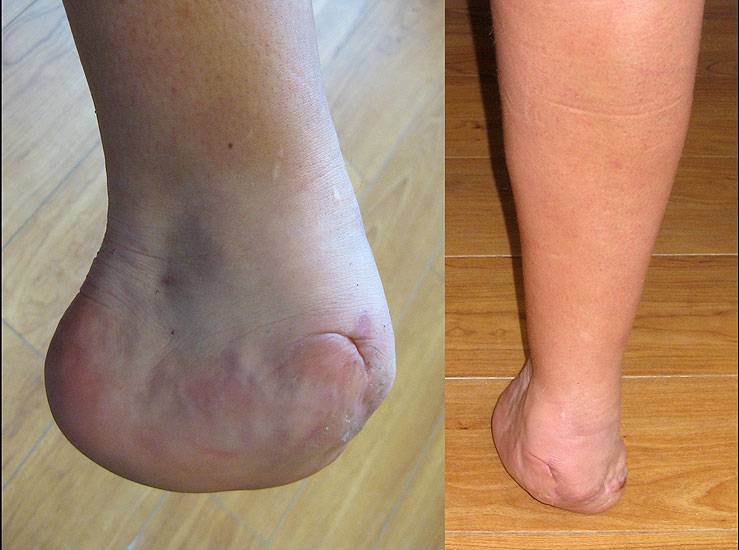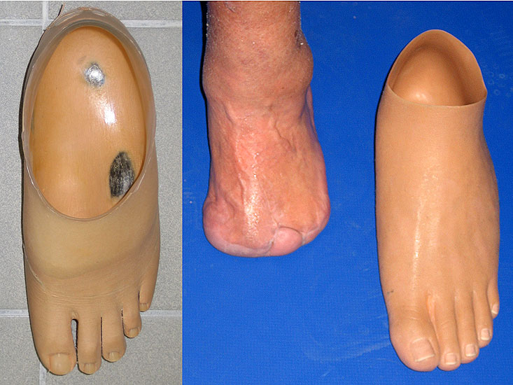b) Ziel einer Prothesenversorgung bei Rückfußstümpfen oder sehr kurzen Fußwurzelstümpfen ist neben der guten kosmetischen Versorgung die Ermöglichung eines leistungsfähigen Gangs. Um diesen mechanischen Anforderungen gerecht zu werden, muss die prothetische Versorgung bis unter das Knie reichen. Die immer wieder zu sehende halbhohen Prothesenbauarten verursachen regelmäßig Beschwerden, da die auftretenden Drücke der Bewegungsdynamik auf eine zu geringe Fläche verteilt werden.