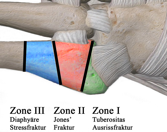 Zone II befindet sich auf Höhe der Articulatio zwischen MT IV und V. Die Zone I liegt proximal, die Zone III distal davon. Interessanterweise vermischen Lawrence und Botte Unfallmechanismen (Avulsionsfraktur/Stressfraktur) und deskriptive Terminologie (Jones’ Fraktur) in ihrer Klassifikation. Eine Vereinfachung dieser Klassifikation publizierten Polzer et al. 2012 7. Basierend auf den Ergebnissen von sechs prospektiven Behandlungsstudien (systematische Literaturrecherche), schlussfolgerten die Autoren, dass Lawrence und Botte Zone I und II Frakturen zusammengefasst werden könnten (Metaphysäre Frakturen). Zone III Frakturen werden als Meta-Diaphysär beschrieben.