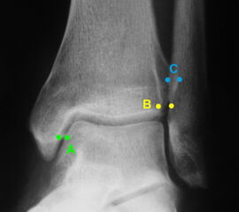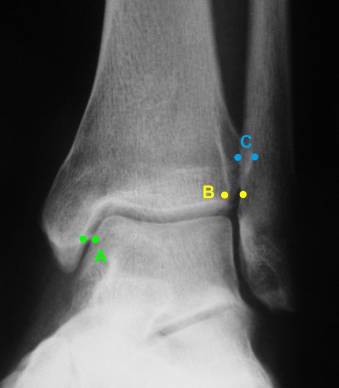 Röntgenaufnahmen dienen primär dem Ausschluss einer knöchernen Verletzung. Die Beurteilung der Geometrie der Malleolengabel kann einen ersten Hinweis auf eine Syndesmosenverletzung liefern. Die notwendigen Röntgenaufnahmen umfassen das Sprunggelenk anterior-posterior, lateral und in 20° Innenrotation (Mortise view). Zur Beurteilung der Syndesmose sind verschieden Parameter in der Mortise view beschrieben. Zu diesen zählen der tibiofibulare Clearspace, der mediale Clearspace, sowie die Überlappung der distalen Fibula und Tibia im Bereich der Incisura (Abbildung 2). Der Tibiofibulare Clearspace wird als verlässlichster Indikator für eine Syndesmosenverletzung gesehen, da er nicht signifikant von der tibialen Rotation beeinflusst wird 32. Er wird 1 cm proximal des Tibiaplafonds gemessen und sollte weniger als 6mm betragen 33. Jede Messung, die diesen Wert übersteigt, stellt einen Hinweis für eine Syndesmosenverletzung dar. Eine tibiofibulare Überlappung von 6 mm oder mehr in der AP Aufnahme, sowie mehr als 1 mm in der Mortise View Aufnahme gelten als physiologisch 33. Der mediale Clearspace sollte nicht mehr als 4 mm betragen 34.