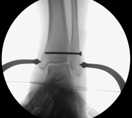 Auch bei Revisionseingriffen an der Syndesmose (z.B. bei Verkalkungen) in Folge einer Verletzung verwenden wir dieses Stabilisationsregime 61. Um Verkalkungen aus der Syndesmose vollständig zu entfernen ist meist eine Durchtrennung der Syndesmosenbänder notwendig, so dass am Ende der Operation die Syndesmose wieder stabilisiert werden muss. Die Nachbehandlung umfasst eine Teilbelastung mit 10 kg, freie Bewegung des Sprunggelenks nach Abheilung der Wunde und die Aufbelastung nach Entfernung der Stellschraube. Werden Verkalkungen aus der Syndesmose entfernt, führen wir eine medikamentöse Ossifikationsprophylaxe durch (analog Hüftendoprothetik)62, im Rezidivfall kann eine zusätzliche Bestrahlung diskutiert werden 6364.