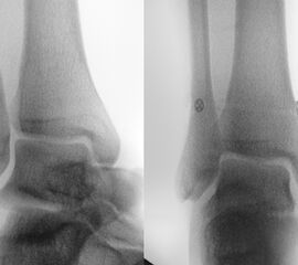 | Grad III | instabil | Komplette Ruptur vorderes Syndesmosenband, Einriss der Membrana interossea. Sonderformen: Trillaux-Chaput-Fraktur: Knöcherner Ausriss der vorderen Syndesmose mit Tibiafragment Wagstaffe-Fraktur: Knöcherner Ausriss der vorderen Syndesmose mit Fibulafragment Volkmann-Fraktur: Knöcherner Ausriss der hinteren Syndesmose mit Tibiafragment. |