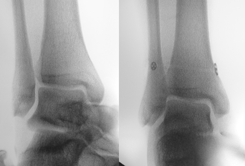 Abbildung 3 zeigt ein Sprunggelenk nach Syndesmosenverletzung mit einem erweiterten Tibiofibularen Clearspace.
