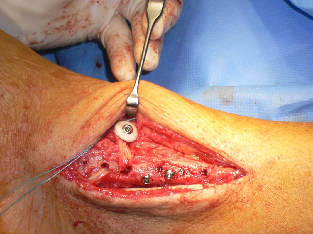 Die offene Syndesmosenrekonstruktion ermöglicht die direkte Darstellung der Syndesmose, des Vorderrandes der distalen Tibia und der distalen Fibula. Die direkte Visualisierung der Syndesmose reduziert das Risiko einer nicht adäquaten Reposition 11, allerdings ist das Risiko einer Wundheilungsstörung höher als bei minimalinvasiven, perkutanen Verfahren.
