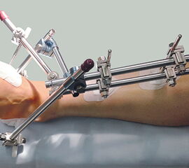 Luxationsfrakturen (Abbildung 7) sollten unter i.v.-Analgesie so schnell wie möglich reponiert werden, um Haut- und Weichteilschäden, Störungen der Durchblutung und Sensibilität, sowie den durch die Fehlstellung bedingten Druck auf den Knorpel zu verringern. Anschließend erfolgt die Ruhigstellung in einem gespaltenen Unterschenkelgips. Offene Frakturen, geschlossene Frakturen mit kritischen Weichteilverhältnissen, sowie hochgradig instabile Frakturen, die sich unter entsprechender Analgesie nicht zufriedenstellend reponieren bzw. retinieren lassen, stellen eine Notfallindikation dar. In diesen Fällen sollte die Anlage eines Fixateur externe erfolgen (Abbildung 8). Die definitive Frakturversorgung erfolgt zweizeitig nach entsprechender Konsolidierung der Weichteile. Eine Kompartment-Spaltung ist bei OSG-Frakturen nur sehr selten erforderlich.