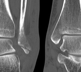 Liegt eine Fraktur des oberen Sprunggelenks vor, ist sowohl zur Entscheidung für ein konservatives oder operatives Vorgehen, als auch zur Operationsplanung, ein ausreichendes Verständnis der Fraktur und ihrer Morphologie notwendig. Insbesondere bei komplexen Verletzungen ist dafür die konventionelle Röntgenaufnahme in vielen Fällen nicht ausreichend. So konnten z.B. Black et al. zeigen, dass die operative Strategie zur Versorgung von OSG-Frakturen in 24% basierend auf einer zusätzlichen CT-Bildgebung relevant geändert wurden 7. Dies betraf die Lagerung, die Wahl des Zuganges und die Art der osteosynthetischen Versorgung. Besonders häufig änderte sich das Vorgehen bei Verletzungen des medialen (21%) und des posterioren Malleolus (15%). Darüber hinaus führten dislozierte (dislozierte Frakturen 31% vs. nicht-dislozierte Frakturen 20%) oder komplexe Frakturen (Trimalleolar-Frakturen 29% vs. Unimalleolar-Frakturen 10%) besonders häufig zu relevanten Änderungen des operativen Vorgehens. Die Computertomographie ist daher, insbesondere bei Bi- und Trimalleolar-Frakturen, essentiell für das Verständnis der Fraktur und somit für die Planung und Durchführung der Operation. In Abbildung 4 und 5 sind exemplarisch ein Röntgen- und ein CT Befund gegenübergestellt.