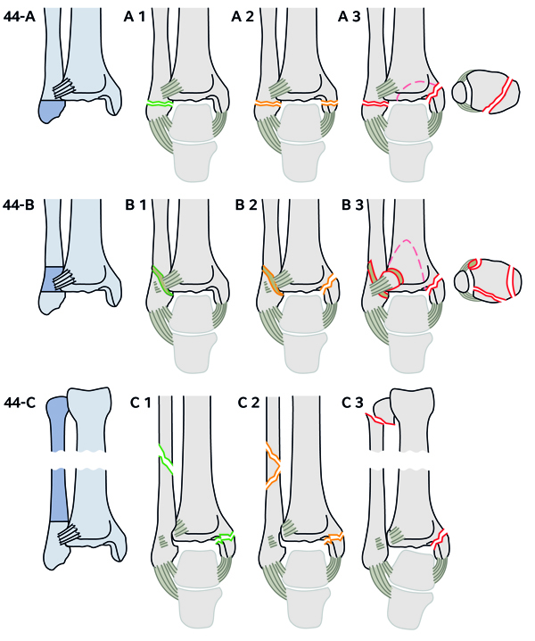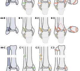 Die AO-Klassifikation basiert auf der Danis-Weber-Klassifikation, berücksichtigt aber neben der Frakturhöhe der Fibula auch die für die Stabilität essentiellen Verletzungen der medialen und posterioren Strukturen. Für die drei Typen (infra-, trans- und suprasyndesmal) werden jeweils drei Typen unterschieden (Abbildung 6), die jeweils in 3 weitere Untergruppen unterteilt werden. Daraus resultieren insgesamt 27 verschiedene Frakturtypen. Im Vergleich zur Klassifikation nach Lauge Hansen weist sie eine bessere Reproduzierbarkeit auf 10.