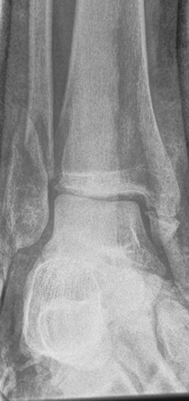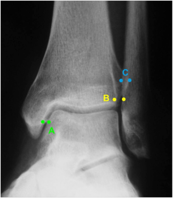Die Standard-Röntgenaufnahmen des oberen Sprunggelenks bestehen aus drei Aufnahmen: der antero-posterioren Aufnahme (ap), der antero-posterioren Aufnahme mit Innenrotation des Unterschenkels von 20° („Mortise view“), sowie der streng seitlichen Aufnahme (siehe S2-Leitlinie Sprunggelenksfraktur). In der Röntgen-Bildgebung sollte neben den klassischen Frakturzeichen die Integrität der Syndesmose beurteilt werden. Dies erfolgt über die Beurteilung der Breite des lateralen und medialen Gelenkspalts („medial clear space“), des tibiofibularen Abstands 1cm oberhalb des OSG-Gelenkspalts („tibiofibular clear space“), bzw. der tibiofibularen Überlappung. Eine Verbreiterung des tibiofibularen Abstands über 5 mm oder die Erweiterung des medialen Gelenkspalts können Zeichen einer begleitenden Syndesmosenverletzung sein. (Abbildung 3) 6.