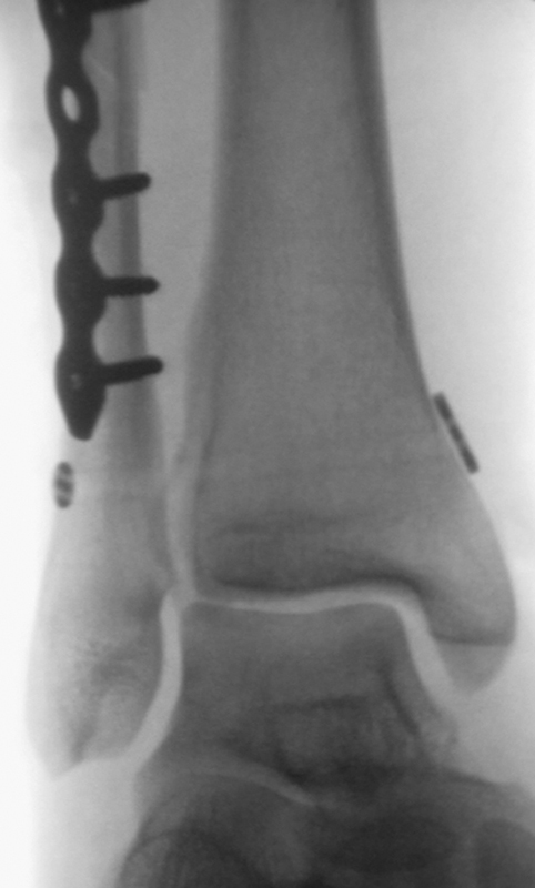 Die Versorgung mit einer dorsalen Antiglide-Platte konnte biomechanische Vorteile zeigen, führt allerdings gerade bei sehr distaler Plattenlage häufig zu Irritationen der Peroneal-Sehnen 24. Eine Testung der Syndesmosen-Stabilität unter Bildwandler-Kontrolle ist bei Typ B/C Frakturen obligat. Sie sollte aber erst nach Osteosynthese sämtlicher Frakturen am Sprunggelenk durchgeführt werden. Diese kann entweder mittels Hakenzugtest nach lateral und dorsal (Hook-Test) oder Außenrotation des Fußes bei fixiertem Unterschenkel (Frick-Test) erfolgen.