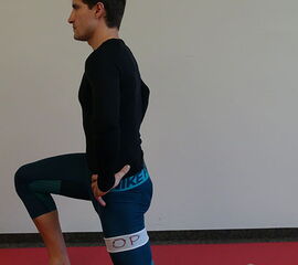 Das Knie des operierten Beins wird in den Boden geschoben, der Kopf (nicht das Kinn!) wird Richtung Decke orientiert. Das Becken wird aufgerichtet nach vorne geschoben, dabei nicht ins Hohlkreuz fallen (Bauchspannung halten).