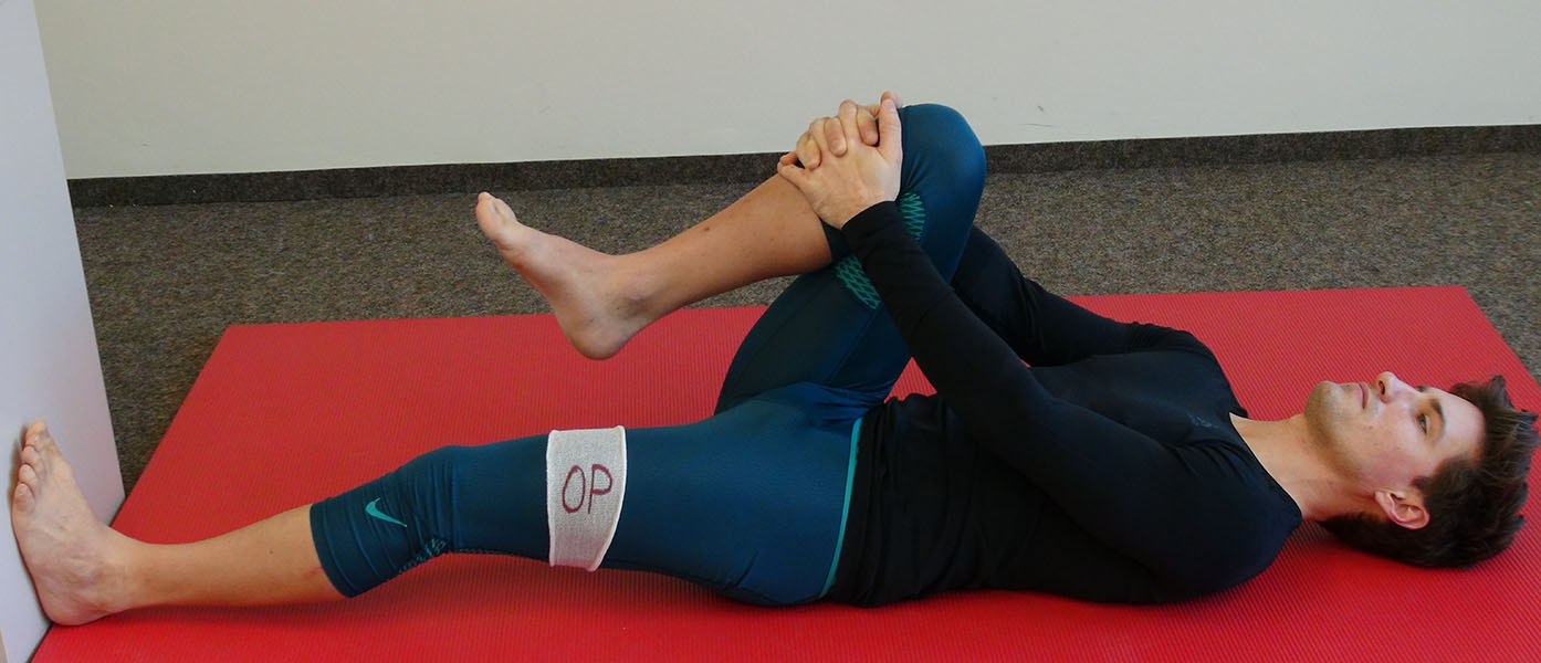 Rückenlage, das nicht operierte Bein wird im Hüft- und Kniegelenk maximal angebeugt und mit den Händen festgehalten. Das operierte Bein ist durchgestreckt, der Fuß berührt die Wand/Bettende.