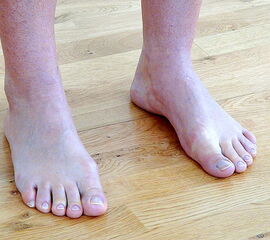 Stehen Sie mit der Vorstellung, den Kopf zur Decke zu schieben und die Fersen in den Boden zu schieben. Jetzt beide Großzehenballen aktiv über Muskelkraft (siehe Übung II) gegen den Boden schieben und die Fersen aktiv aufrichten.