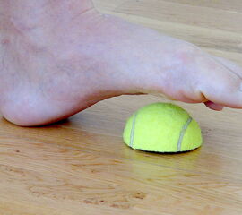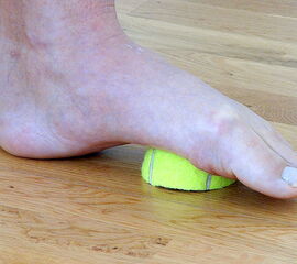 Die Übung kann auch im Sitzen gemacht werden. Wenn Sie keinen halben Tennisball zur Verfügung haben, können Sie das auch mit einer zusammengerollten Socken oder etwas Ähnlichem machen. In Schuhen, z.B. am Schreibtisch kann die Vorstellung auch sein, die Mitte des Vorfußes von der Sohle zu lösen ohne die Zehen in den Schuh nach unten zu pressen.