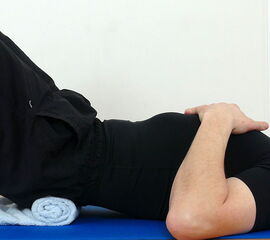 Ausgangsstellung: Rückenlage, beide Beine angestellt, feste Handtuchrolle unter dem Kreuzbein positioniert.