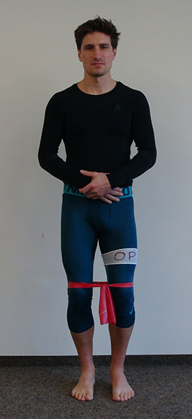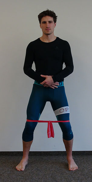 Stand mit einem Theraband um beide Oberschenkel. Die Knie sind angebeugt, der Oberkörper ist leicht nach vorne geneigt.